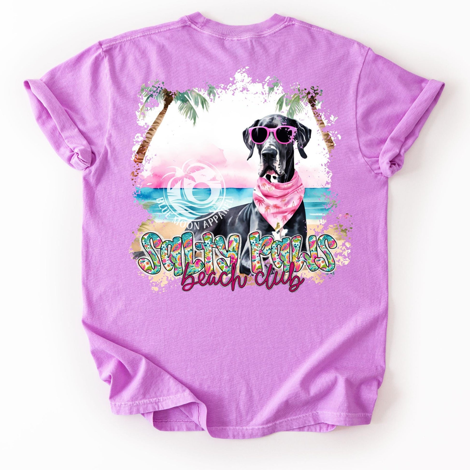 Great Dane Doggie Lover- Salty Paws Social Club- Dog Days Summer- Beachy Puppy - Tropical Women‘s Shirt- Preppy Floral Vacation Pocket Back Tee