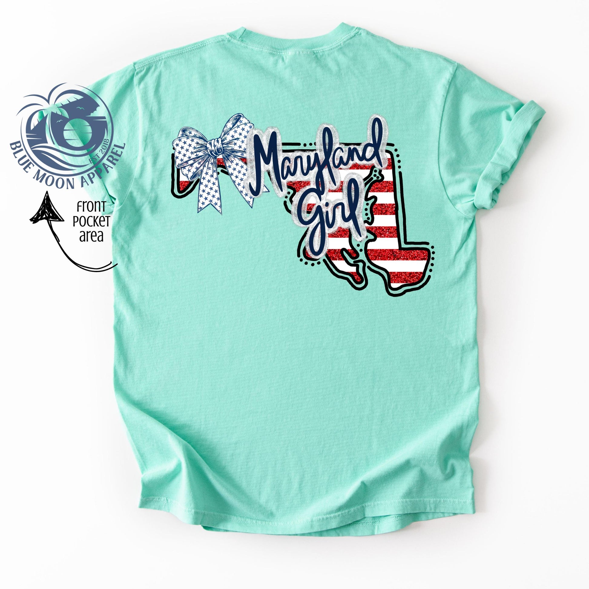 Maryland Girl- 4th July Patriotic -Southern Lifestyle- Star Stripes Coquette Bow- Red White Blue Sparkle- Women‘s Printed Graphic Tee- Pocket Back Screen Tshirt